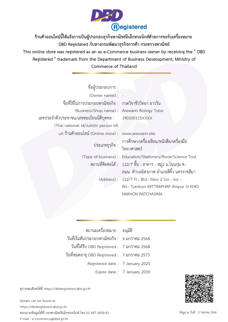 กวดวิชาของเราได้จดทะเบียนการค้ากับกรมพัฒนาธุรกิจการค้า (DBD) อย่างถูกต้องตามกฎหมาย เพื่อสร้างความมั่นใจให้กับผู้เรียนและผู้ปกครองทุกท่าน